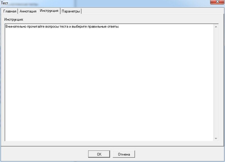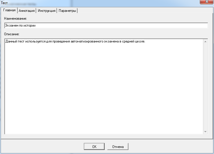 Окно создания или изменения теста включает набор вкладок, на которых с помощью специальных элементов интерфейса можно изменять свойства теста. В частности, определены следующие вкладки: «Главная», «Аннотация», «Инструкция» и «Параметры».