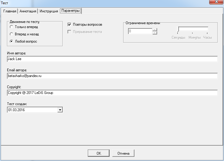 указать права автора теста в поле «Copyright» или использовать данные по умолчанию для выбранного теста;