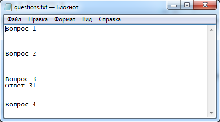 Для этого сначала необходимо подготовить текстовый файл, в котором каждый вопрос и ответ содержатся на отдельной строке текста. При этом первым в списке всегда идет вопрос, а все остальные строки до ближайшей пустой строки считаются его ответами. Группу из вопроса и его ответов можно разделять любым числом пустых строк, но хотя бы одна такая должна обязательно присутствовать.