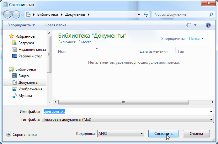 Сохраним данные в файле «questions.txt». При этом выберем кодировку ANSI.
