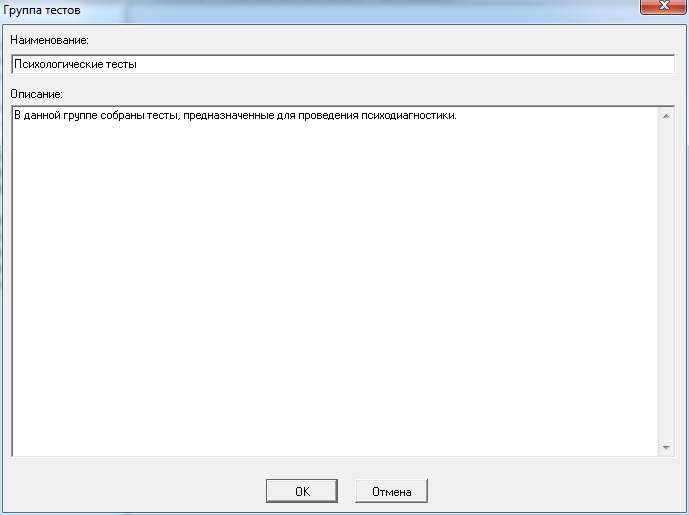 Для подтверждения вызванной операции нажмите кнопку OK. При создании группы тестов будет создана новая группа тестов, а при изменении – для выбранной группы тестов будут сохранены новые свойства.